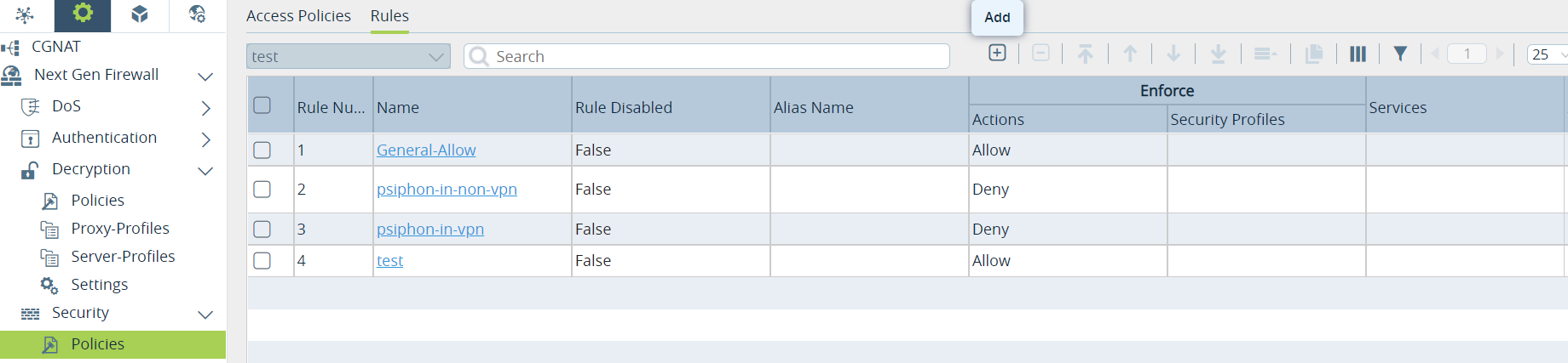 Note:- Here you can see presence of Rules 2 & 3 for Blocking psiphon in Non-VPN and VPN modes respectively. Also noticeable is Rule 1 which allows legitimate browsing traffic for reference. In production, you may have to create many such rules.