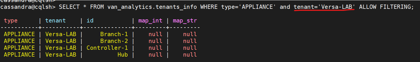 SELECT * FROM van_analytics.tenants_info WHERE type='APPLIANCE' and tenant='Versa-LAB' ALLOW FILTERING ;