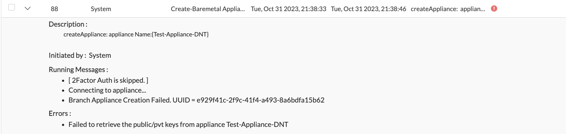 Failed to retrieve the public/pvt keys from appliance <Branch>