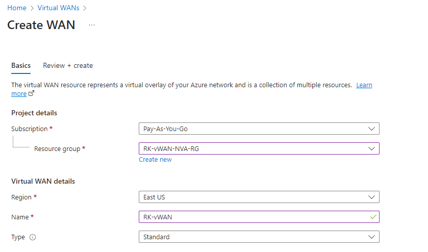 The virtualWAN resource represents a virtual overlay of your Azure network and is a collection of multiple resources. It contains links to all your virtual hubs that you would like to have within the virtual WAN. Virtual WANs are isolated from each other and can't contain a common hub. Virtual hubs in different virtual WANs don't communicate with each other. vWAN is a global object but still it asks for resource group. Meta data will be stored in RG.