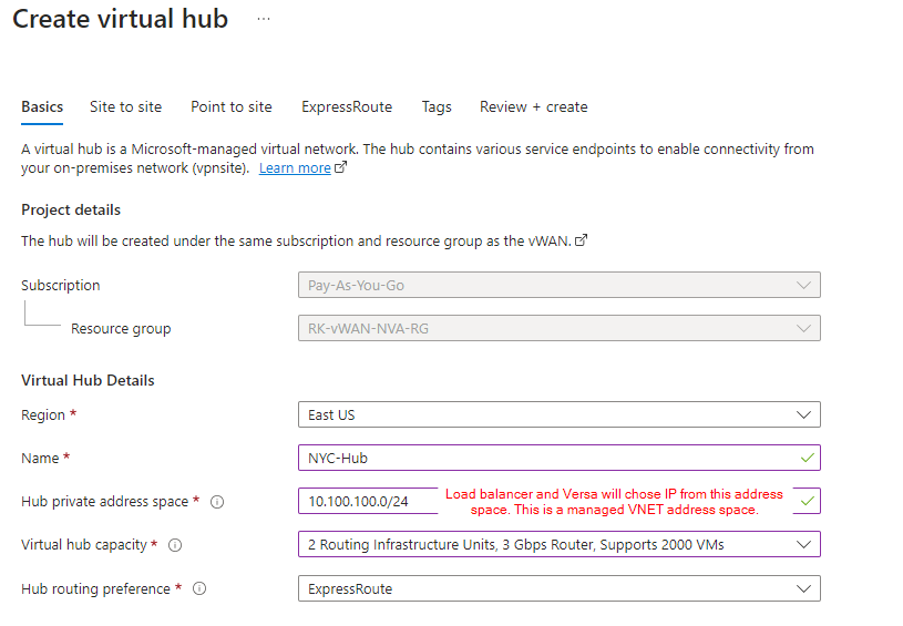 A virtual hub is a Microsoft-managed virtual network. Creating a Hub Can take approx 30 minutes.