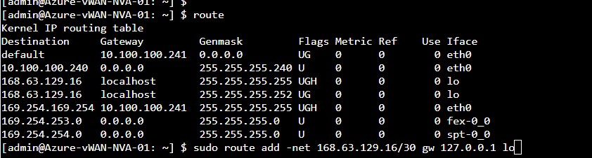 sudo route del 168.63.129.16 gw 10.100.100.241