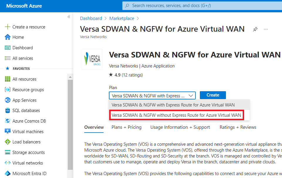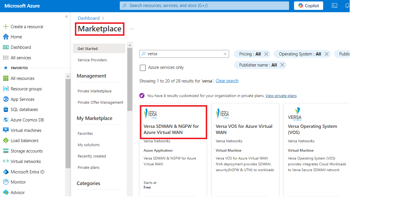 On the Azure portal, go to the Azure Marketplace and search for Versa. Select the below offering "Versa SDWAN & NGFW for Azure Virtual WAN" as shown below.
