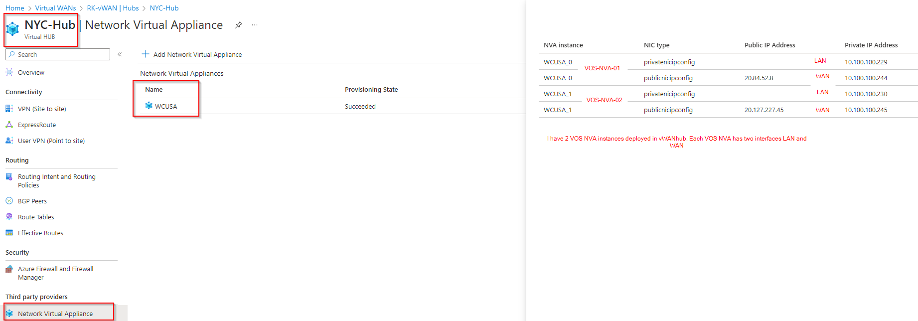 | RK-vWAN-NVA-RG | East-US | Managed VNET-vWAN | 10.100.100.0/24 | WAN | 10.100.100.240/28 |