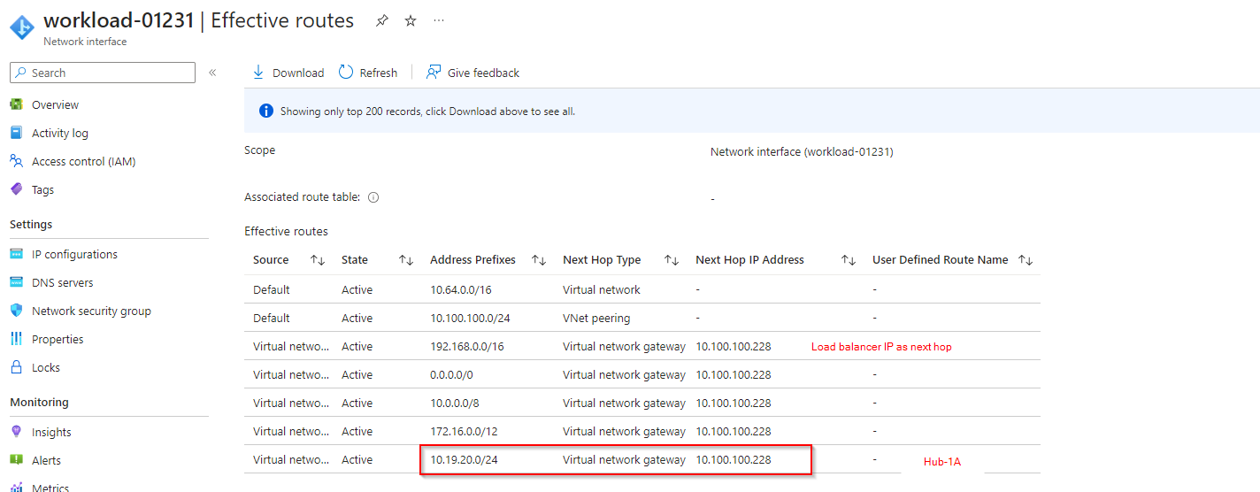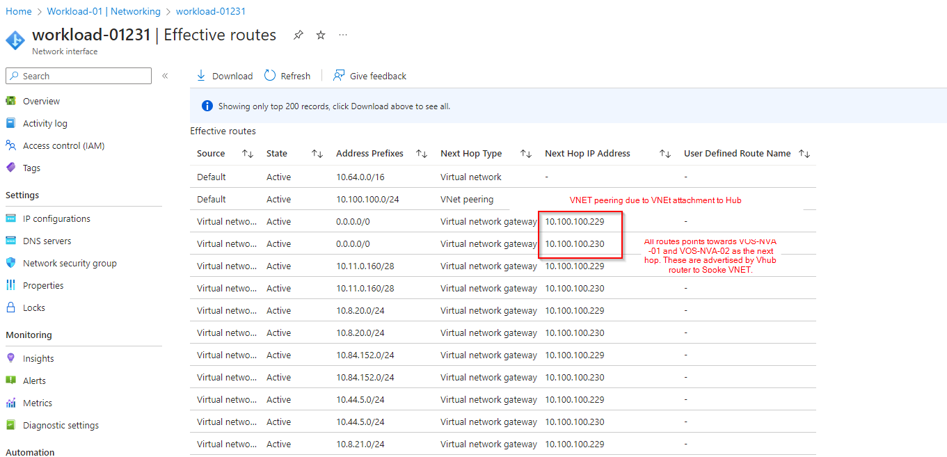 Workstation Effective routes in Spoke-VNET-01 after routing Intent