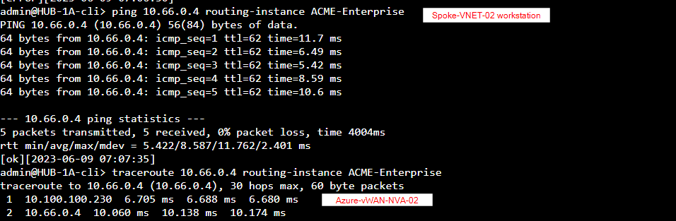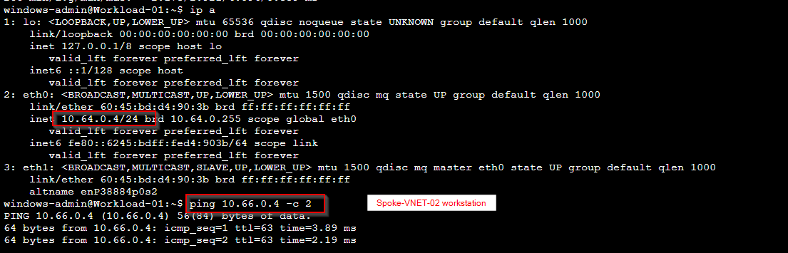 Ping from Hub-1A to Spoke VNET-02 workstation
