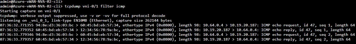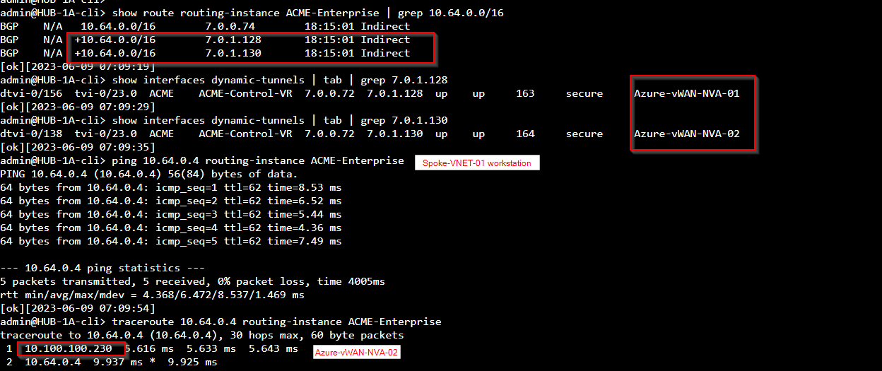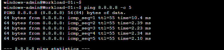 Ping 8.8.8.8 from workstation in Spoke-VNET-01. Internet traffic is going through VOS DIA.