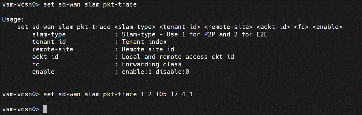 set sd-wan slam pkt-trace 1 2 105 17 4 0 >>>last value should be ( 0 Disable;1Enable)