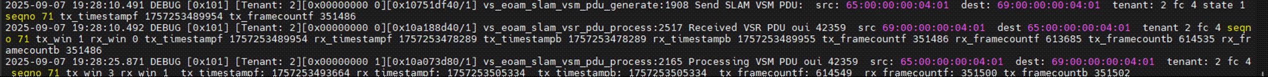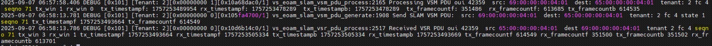 2025-10-23 12:50:59.324 DEBUG [0x101] [Tenant: 1][0x00000000 0][0x107e6f640/1] vs_eoam_slam_vsm_pdu_generate:1908 Send SLAM VSM PDU: src: 66:00:00:00:00:02 dest: 01:00:00:00:00:02 tenant: 1 fc 0 state 1 seqno 8 tx_timestampf 1761187784340 tx_framecountf 564542
