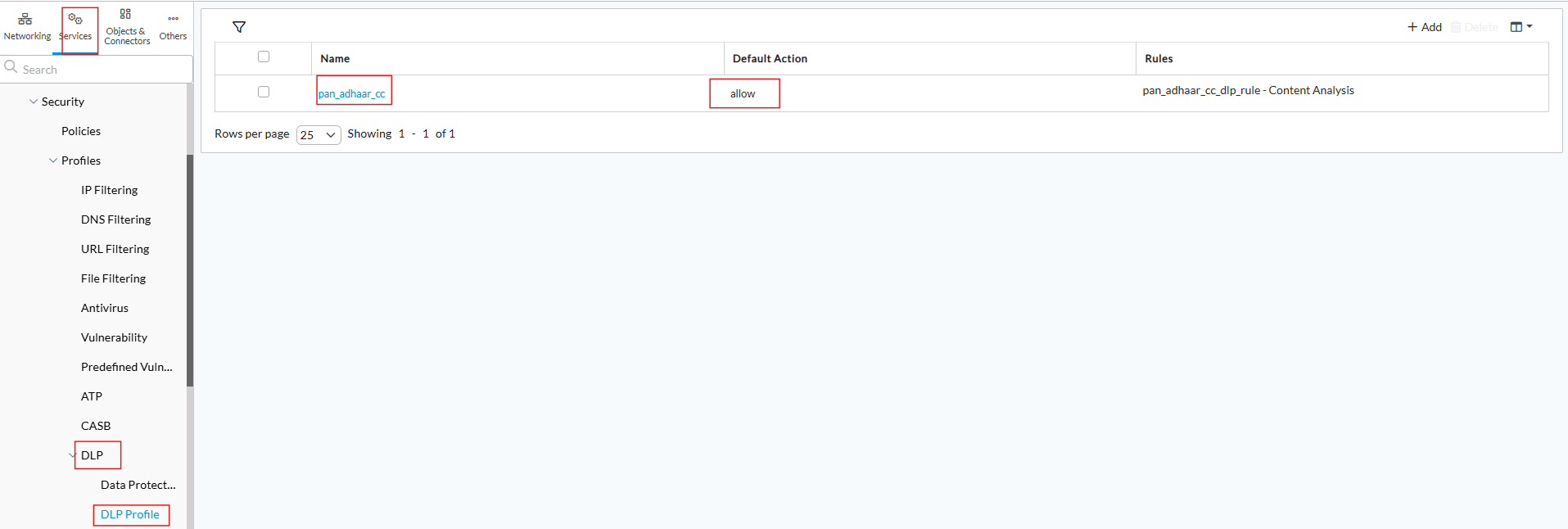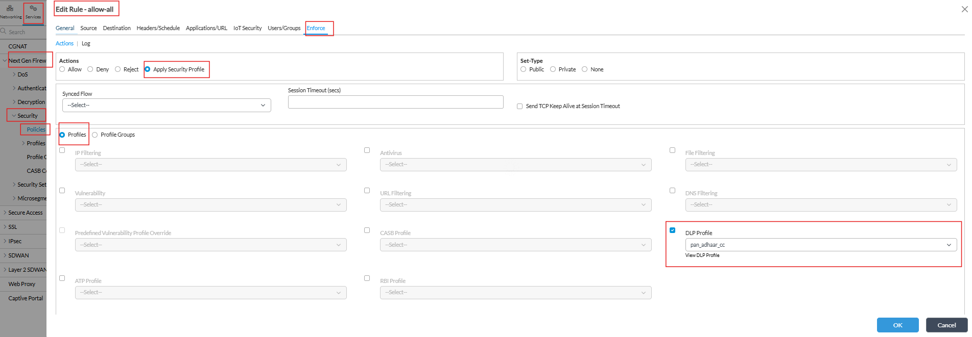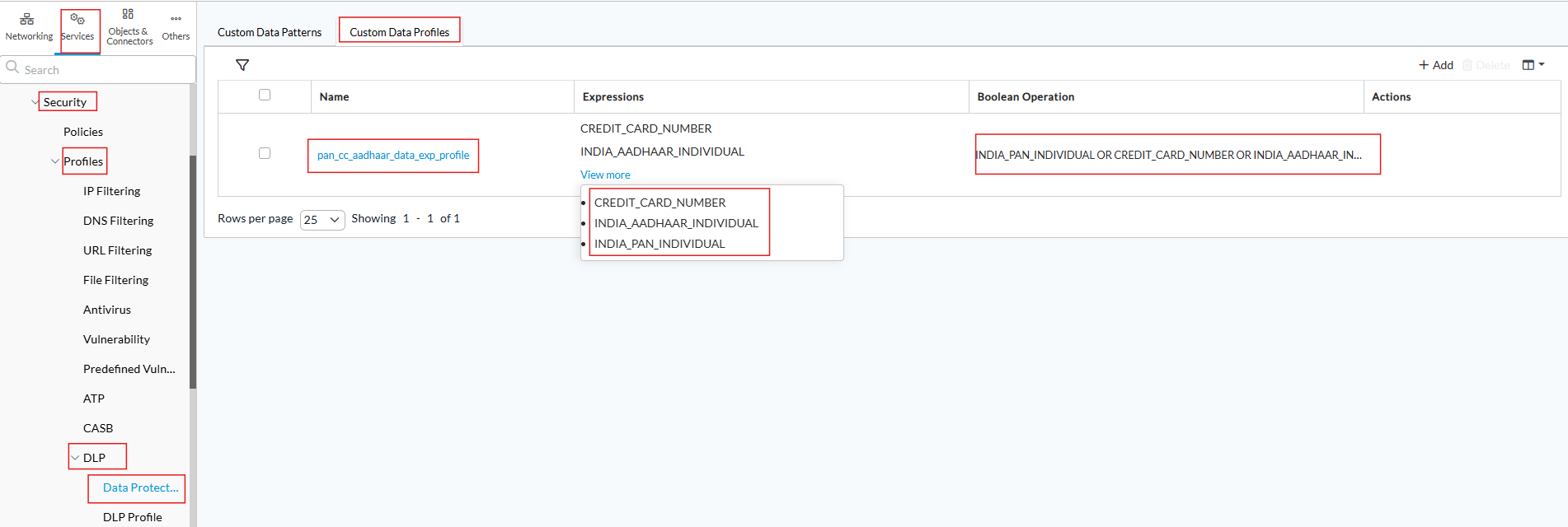 Configure the DLP data pattern profile in Services ->Security->Profiles->DLP->Data Protection using the predefined expressions or user defined expressions as shown below, for example we are taking the predefined patterns for aadhaar,pan and credit card.