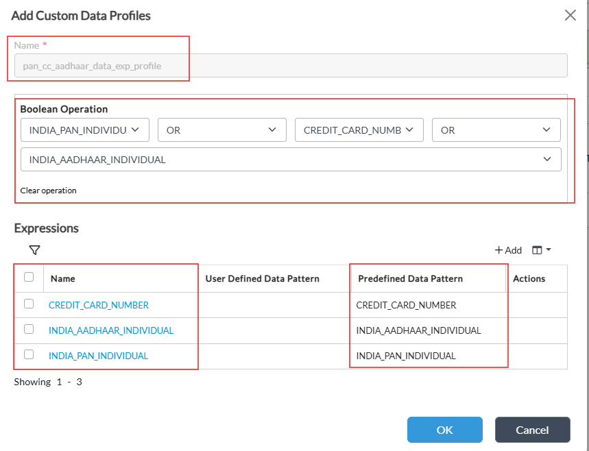 set orgs org-services Tenant1 security profiles dlp data-protection custom-data-profiles pan_cc_aadhaar_data_exp_profile boolean-operation "INDIA_PAN_INDIVIDUAL OR CREDIT_CARD_NUMBER OR INDIA_AADHAAR_INDIVIDUALStep 2