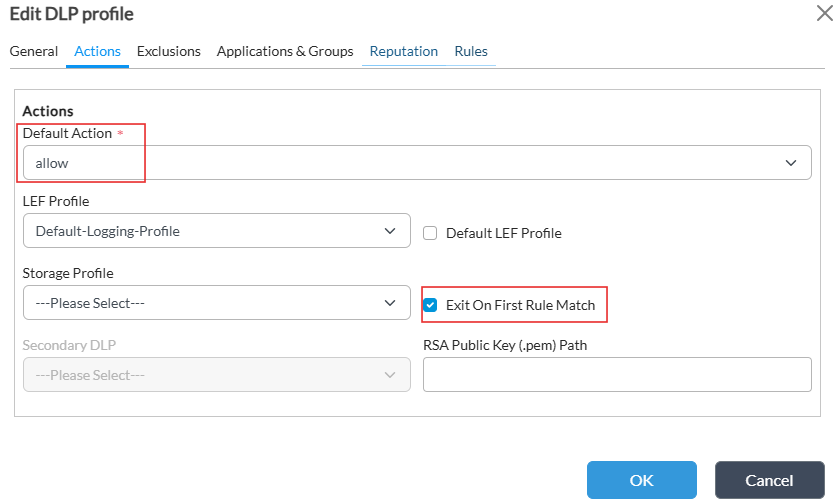 - Do not select the default action in the DLP profile to block, id you do and the Rules are not explicitly allowing files then this will cause traffic blackhole.