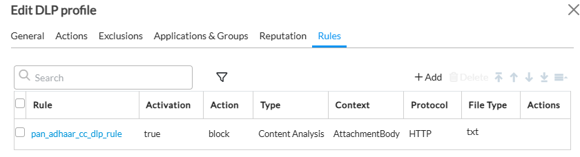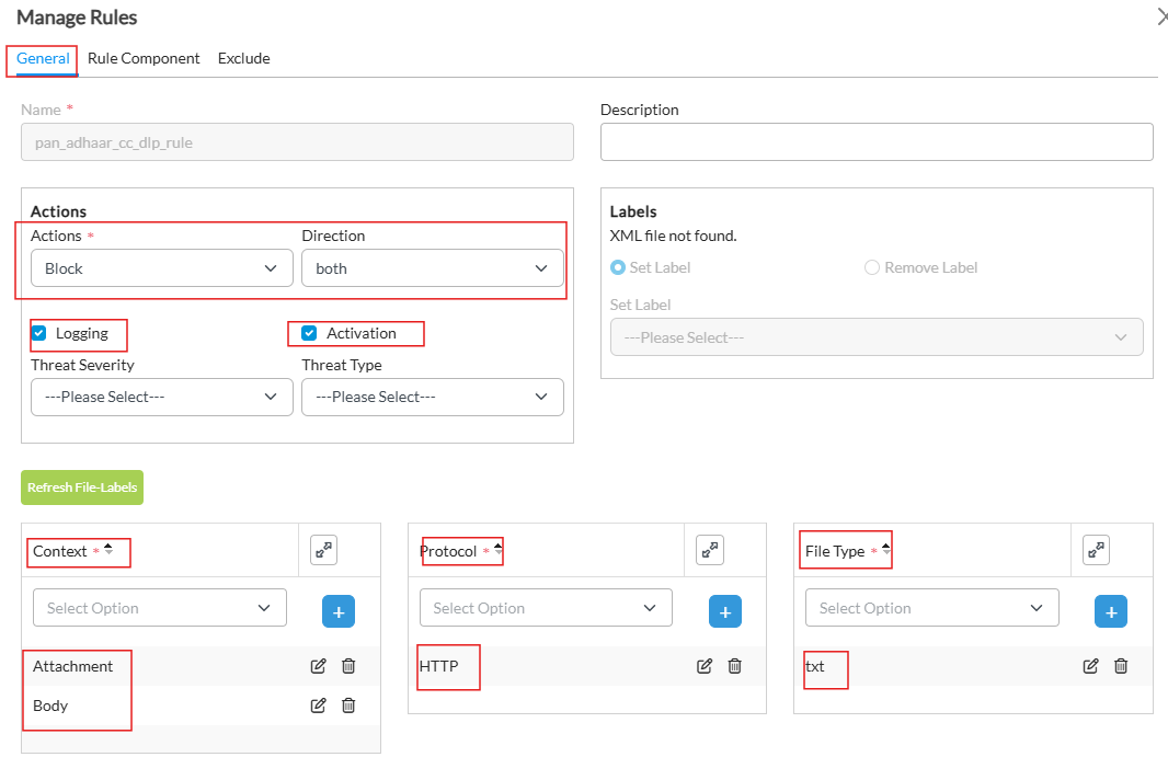 - DLP Rules →DLP Rules uses one or more Data Protection Profiles and determine how detection occurs and what action is enforced. Do not select Header in DLP policy until it’s explicitly required.