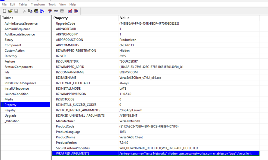 High Level Design This process involves editing the standard MSI installer using the Orca tool to inject a specific property (WRAPPED_ARGUMENTS). This property passes the necessary Enterprise and SSO parameters to the client during installation.