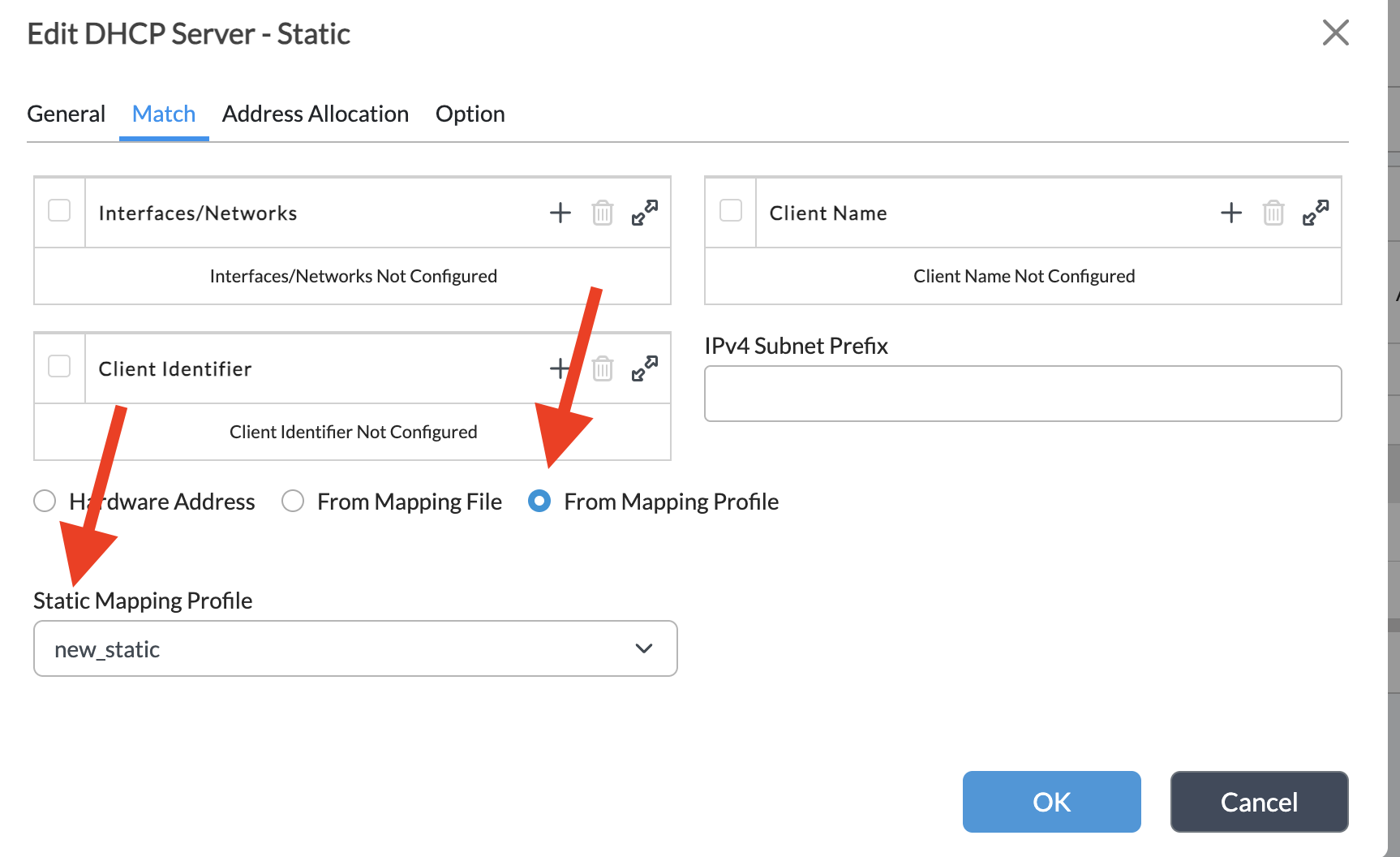 Under match - In addition to matching on basis of Interfaces/networks, we need to also add the match criteria for the hosts that the static server will assign static IPs to.