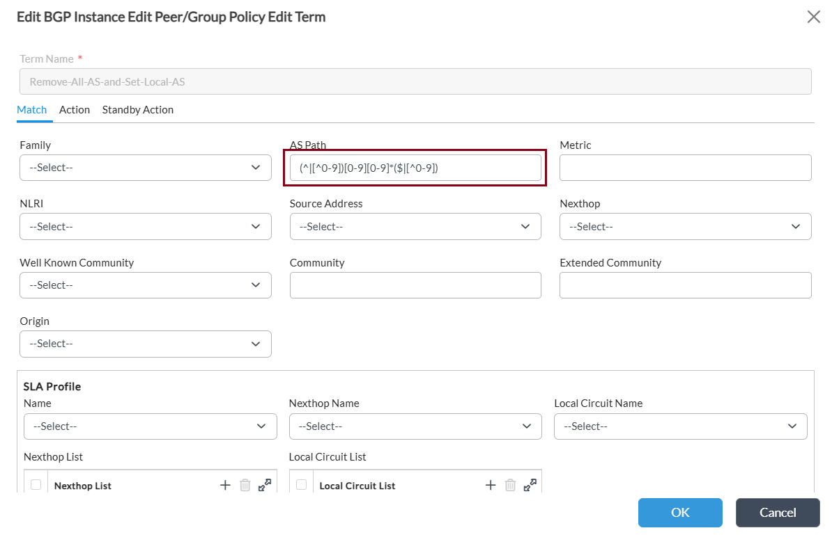 Go to routing peer policy and add term to match with regex (^|[^0-9])[0-9][0-9]*($|[^0-9]) in AS path and choose "Remove all AS numbers matched by match as-path" under action.