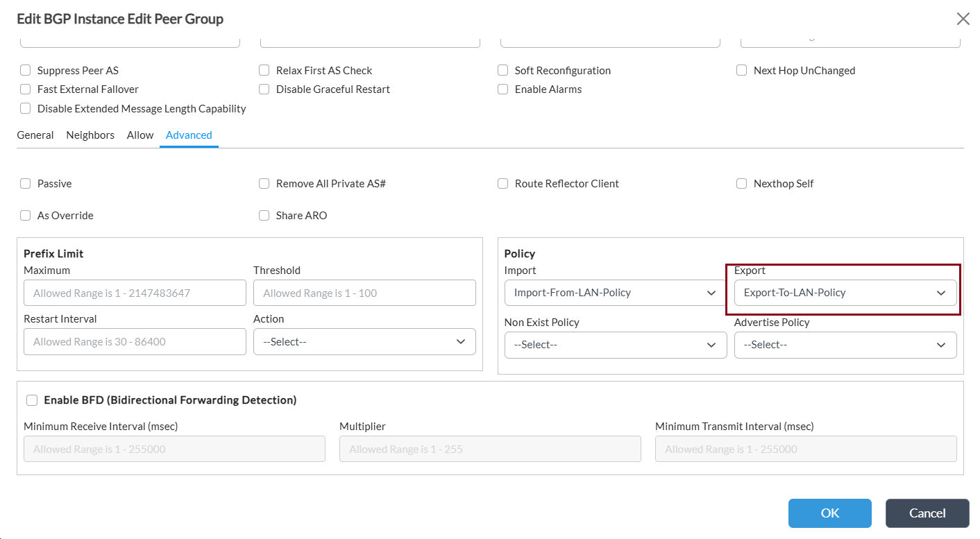 admin@SDWAN-Branch4-cli(config)% show routing-instances Tenant1-LAN-VR protocols bgp 3033 routing-peer-policy Export-To-LAN-Policy