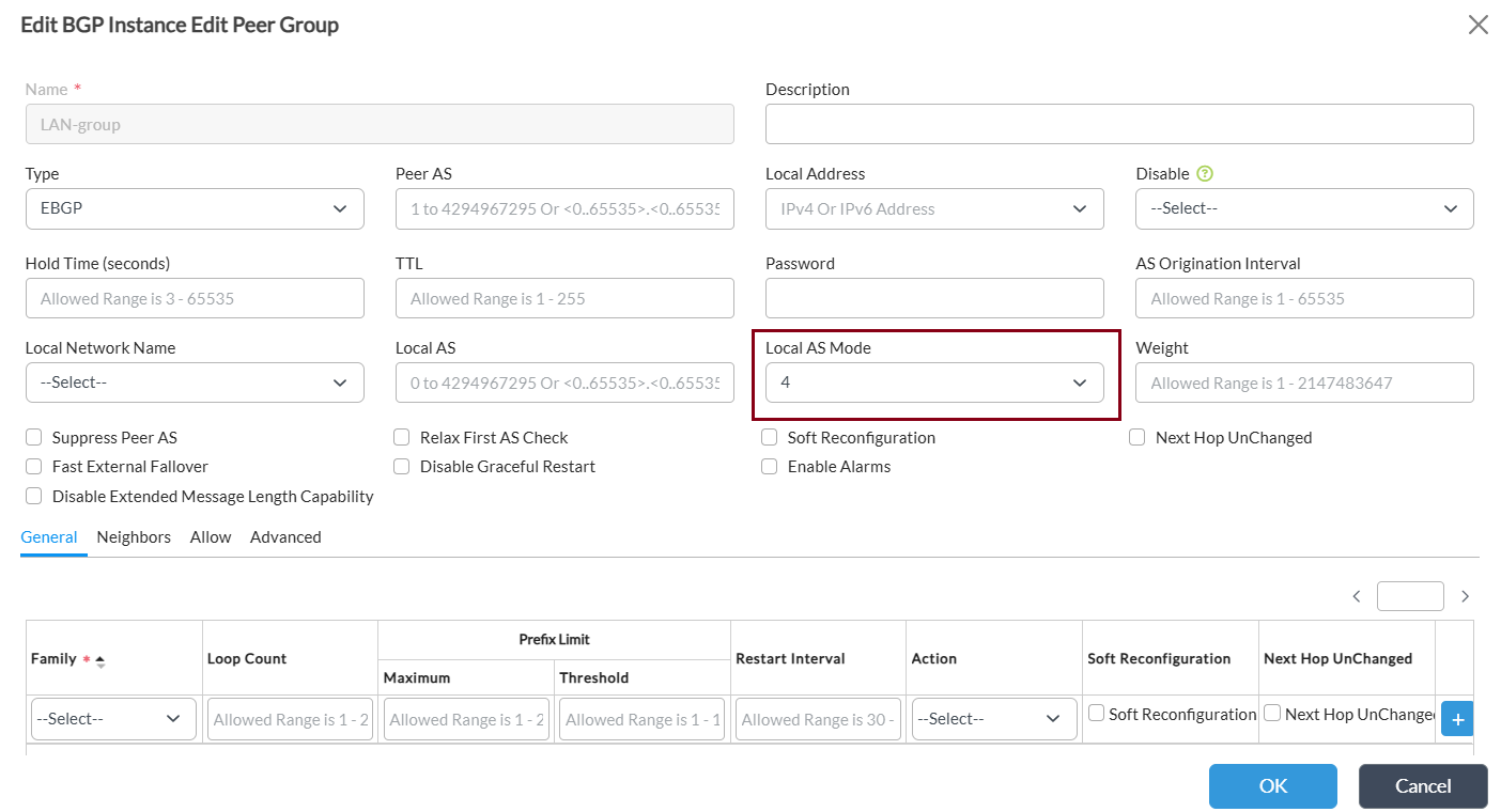 2. Set Local AS Mode to 4 either under group or neighbor level